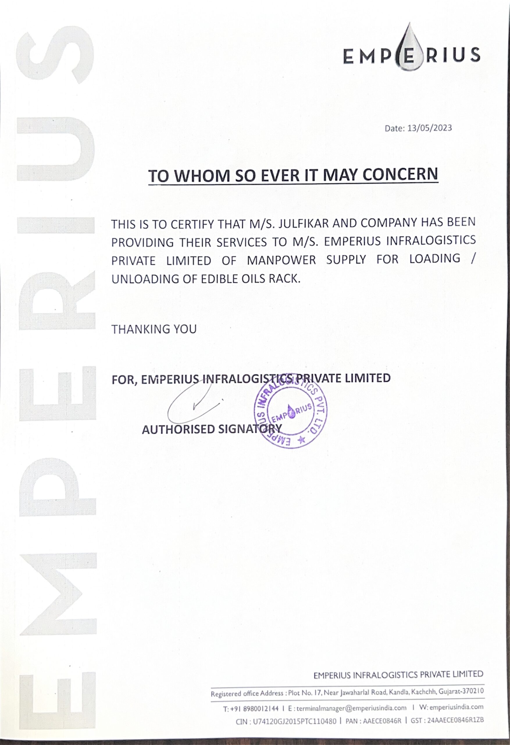 M/S. EMPERIUS INFRALOGISTICS PVT LTD for manpowering supply.